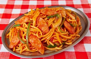 スパゲッティにトマトケチャップをからめ、炒めて作る。代表的な具材はタマネギ、ピーマンであり、これにハム、ウインナーソーセージ、ベーコン等の加工肉が加わる。