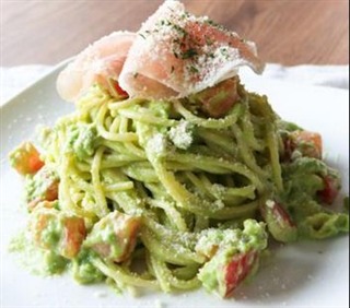 アボカドとクリームチーズを刻んで、ソース上にし、パスタと混ぜ合わせたもの。