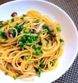 茹でたパスタに、バター醤油をかけ、ツナやきのこ、葉物などを和えたもの。